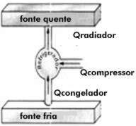 Desse modo, a energia liberada pelo fluido durante sua passagem pelo radiador (Qradiador) corresponde à soma da quantidade de energia absorvido por ele no congelador (Qcongelador) com o acréscimo de energia interna adquirida em função da realização de trabalho sobre ele pelo motor. (Wcompressor).