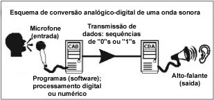 PARA SABER MAIS: Modulação de sinais na telefonia digital Os telefones celulares analógicos são emissores e receptores de rádio que utilizam freqüência modulada -FM- para a transmissão de sinais. Os telefones celulares digitais também são emissores e receptores de rádio. No entanto, eles utilizam um outro tipo de modulação ou codificação de sinais: a modulação por código de pulso. Como todos os microfones são aparelhos analógicos, a transmissão de sinais digitais em um aparelho telefônico, ou mesmo em um disco de CD, pressupõe a conversão de sinais analógicos em sinais digitais. Quando um sinal digital é finalmente produzido, um fluxo de números binários pode levar a informação desde um aparelho emissor até um aparelho receptor. À medida que os dígitos binários que representam o sinal original são produzidos, vão sendo usados para modificar a freqüência de uma onda portadora do sinal. Esse processo é conhecido por modulação por código de pulso.