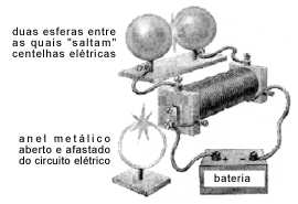 Em 1887, Heinrich Hertz utilizou um circuito constituído por uma bobina, uma bateria e duas esferas metálicas para transmitir a primeira onda de rádio de um emissor até um receptor. O receptor utilizado por ele era um anel metálico aberto e sem nenhum contato aparente com o circuito elétrico que constituia o emissor. Hertz observou que a produção de uma centelha elétrica entre as duas esferas do circuito emissor podia produzir outra centelha elétrica no anel metálico receptor (veja a figura 15). Hertz acabava de gerar ondas de rádio que podiam ser transmitidas e captadas à distância pelo anel metálico. Figura 15- Bobina, esferas, bateria e anel metálico utilizado por Heinrich Hertz para gerar a primeira onda de rádio produzida artificialmente pelo homem. Mais tarde, e trinta e dois anos após Alexander Graham Bell ter inventado o telefone, Guglielmo Marconi encontrou uma forma de transmitir a voz humana entre dois aparelhos de rádio. Isso ocorreu em 1907, ano em que Marconi transmitiu o primeiro sinal de rádio através do Atlântico. A invenção de Marconi foi a chave para a difusão do uso das ondas de rádio na comunicação.
