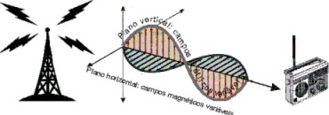 independentemente da presença dos papeizinhos. Figura 18 - Representação de uma onda eletromagnética constituída por campos elétricos e magnéticos variáveis Os campos elétricos e magnéticos variáveis gerados pela antena emissora irão produzir movimentos nos elétrons contidos no interior da antena receptora. Assim, o vai-e-vem executado pelos elétrons no interior da antena emissora acaba sendo executado pelos elétrons da antena receptora. É essa transmissão de vibrações entre os elétrons das duas antenas que nos permite dizer que as ondas de rádio são ondas eletromagnéticas. A freqüência do movimento de vai-e-vem dos elétrons da antena emissora é exatamente a mesma freqüência do movimento dos elétrons da antena receptora. Normalmente, as freqüências utilizadas nas transmissões de rádio tem um valor que varia desde milhares até milhões de vibrações por segundo [de kilo hertz (KHz) até mega hertz (MHz)].