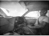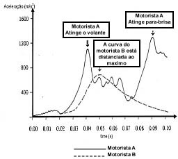 Acima: uutilização de bonecos, sensores e equipamento avançado. De dentro do veículo, a desaceleração é percebida como aceleração do motorista e ele se sente projetado para frente. O gráfico a seguir representa essa aceleração fictícia para os dois motoristas durante a colisão.