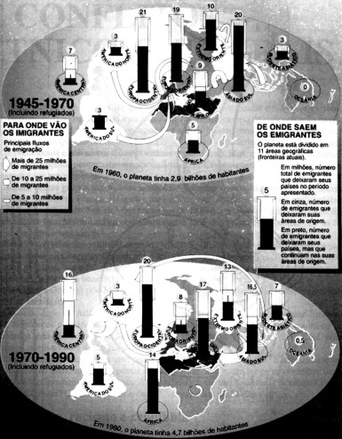 Localize no mapa a direção dos fluxos migratórios identificando: a) As onze áreas geográficas consideradas fronteiras de emissão e recepção de migrantes. b) A localização dos migrantes que deixaram o país, incluindo refugiados, que deixaram o país entre 1945-70. c) A localização do número de emigrantes, incluindo refugiados que deixaram o país, entre 1970-90. d) Compare os dados identificados tentando explicar os motivos da emigração nessas regiões. e) Para onde se deslocam os principais fluxos migratórios. O que justifica esse deslocamento? f) Quais são as regiões de maior emissão de emigrantes? O que justifica essa saída? g) Organize seus registros e construa um texto sobre seu entendimento de fluxo migratório, no período entre 1945-90. Se possível ilustre com imagens coletadas em periódicos. ATIVIDADE 2 - CARTOGRÁFICA 1- De posse de um mapa-múndi, espacialize o fenômeno pesquisado nos filmes vistos e debatidos considerando a localização e o cenário do filme. Crie a legenda adequada. 2- No final tire conclusões envolvendo regiões diferentes a partir de suas observações. ATIVIDADE 3 Investigação e interpretação de fotos 1- Identifique as ondas migratórias atuais analisando as fotos de Sebastião Salgado. As referências estão citadas nas sugestões de leitura e você poderá conseguir outras em publicações da Folha de àEspacialize o movimento num mapa-múndi. 2- Elabore uma conclusão e uma proposição para a compreensão do fenômeno na escala internacional. ATIVIDADE 4 A migração campo/cidade numa abordagem literária Para que possa fazer uma leitura geográfica da obra literária leia os paradidáticos sugeridos nas referências do módulo. 1- Leitura do livro : Uma vida em segredo, do autor Autran Dourado. 2- Identificação da personagem no campo e análise de sua identidade cultural com esse espaço 3- Análise da ruptura vivenciada com a mudança para a cidade discutindo o motivo da migração. 4- Análise da relação da personagem com a cidade: os hábitos, as crendices, os valores, a identificação com a paisagem campestre, os costumes, as tradições, 5- Questionar e inferir: O que significou para os migrantes do campo para a cidade o êxodo rural?