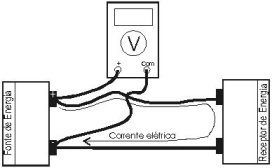 Uma fonte de energia difere de outra pelo valor da tensão existente entre seus terminais e pela potência máxima que ela pode fornecer. A tensão da fonte, medida em Volts, indica a quantidade de energia transferida da fonte de energia ao circuito externo, à medida que cada unidade de carga circula pelo seu interior, independentemente do intervalo de tempo necessário para que isso ocorra. Quando uma carga elétrica positiva de 1 Coulomb circula pelo interior da fonte, do terminal negativo para o terminal positivo, ela transfere 1 Joule de energia elétrica para o circuito externo, para cada 1 Volt de tensão da fonte. Uma bateria de carro, com tensão de 12 Volts, é capaz de transferir 12 Joules de energia para o circuito elétrico do carro enquanto a carga elétrica de 1 C circula pelo seu interior. A tensão da fonte pode ser medida, como mostra a fig. 17, com um voltímetro eletrônico (voltímetro digital), um instrumento comum, de fácil manuseio e barato.