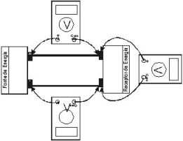 A unidade de resistência é o Volt por Àmpére, unidade que denominamos Ohms e representamos pela letra grega W (ômega maiúsculo). Um aparelho que mede a resistência elétrica é um Ohmímetro. As fórmulas (9) e (11) mostram que a potência elétrica, a tensão da fonte, a intensidade da corrente elétrica que flui pelo circuito e a resistência elétrica do circuito são grandezas relacionadas entre si: num circuito simples, conhecendo-se duas delas, podemos determinar as outras duas. Além disto, só podemos atuar em um circuito selecionando a tensão da fonte ou a alterando a resistência. Veja o caso do chuveiro elétrico. Quando está frio, podemos regular o chuveiro para que ele aqueça mais a água. Mas para aquecer mais a água, ou diminuímos o fluxo da água ou aumentamos a potência elétrica que é transformada em calor. A primeira alternativa é obviamente inconveniente. Resta-nos aumentar a potência elétrica fornecida ao chuveiro. Isso significa que, em cada segundo, o chuveiro estará transformando uma quantidade maior de energia elétrica em calor e aquecendo mais a água. Na posição frio/inverno, um chuveiro comum tem potência em torno de de 2500 a 4000 W. Na posição verão, a potência consumida cai para cerca da metade desse valor. Para aumentamos a potência elétrica fornecida ao chuveiro, ou aumentamos a tensão da rede ou aumentamos a corrente que o percorre. Como a tensão elétrica da rede é fixa, só podemos aumentar a corrente que circula pelo chuveiro. E isso só pode ser feito se o chuveiro tiver um mecanismo que nos permita diminuir sua resistência elétrica. Felizmente, esse mecanismo existe. Da mesma forma que usamos um voltímetro para medirmos a tensão da fonte podemos usar um voltímetro para medir a voltagem entre dois pontos quaisquer do circuito. A figura 18 mostra como ligar o voltímetro para medir a tensão existente entre o início e o final de cada fio e, também, a tensão existente entre os terminais do receptor de energia elétrica.